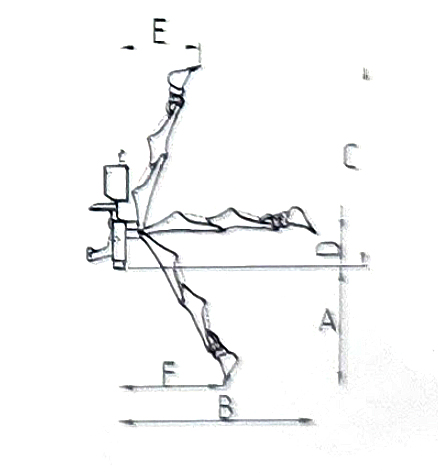 - F: Afstand fra tilkoblingspunkt til støtteben (150 cm)