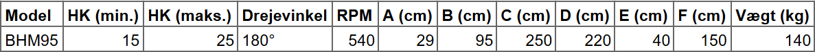 BHM95 har en fast bom, der er konstrueret til at opfylde de fleste generelle behov. Den er kompakt og robust, hvilket gør den ideel til mindre traktorer med 15-25 HK. Gravearmen har en rækkevidde på 180 grader, så du kan nemt nå rundt omkring dig.